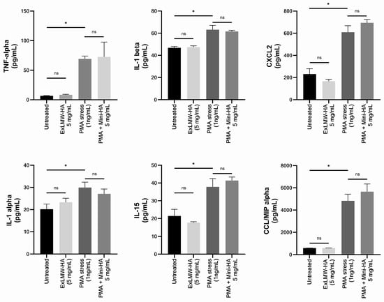 The impact of ExLMW-HA (5 mg/mL) on the release of TNF-alpha, IL-1 alpha, IL-1 beta, CXCL2, IL-15, and CCL3/MIP alpha proteins in the culture medium of skin explants treated for 48 h and exposed or not to inflammatory inducer PMA (phorbol 12-myristate 13-acetate). Values are the mean ± standard error of mean (SEM) of four repetitions per condition. Mann–Whitney statistical test; ns: not significant; * p < 0.05.