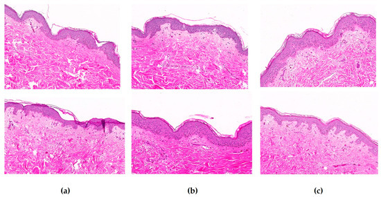 Histological analysis of skin explants that were (a) untreated, (b) cultured with ExLMX-HA at 5 mg/mL, or (c) cultured with ExLMW-HA at 10 mg/mL, for 5 days. Slices were colored with hematoxylin–eosin stain (magnification ×10). Two representative images are presented for each condition.3.4. ExLMW-HA is not predicted to be a skin sensitizer.