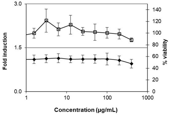 Dose–response curves for ExLMW-HA. Given is the fold induction of the luciferase gene over the solvent control (filled diamonds) and the percentage of viability as determined via the MTT assay (open squares). Values are the mean ± standard deviation of three repetitions.