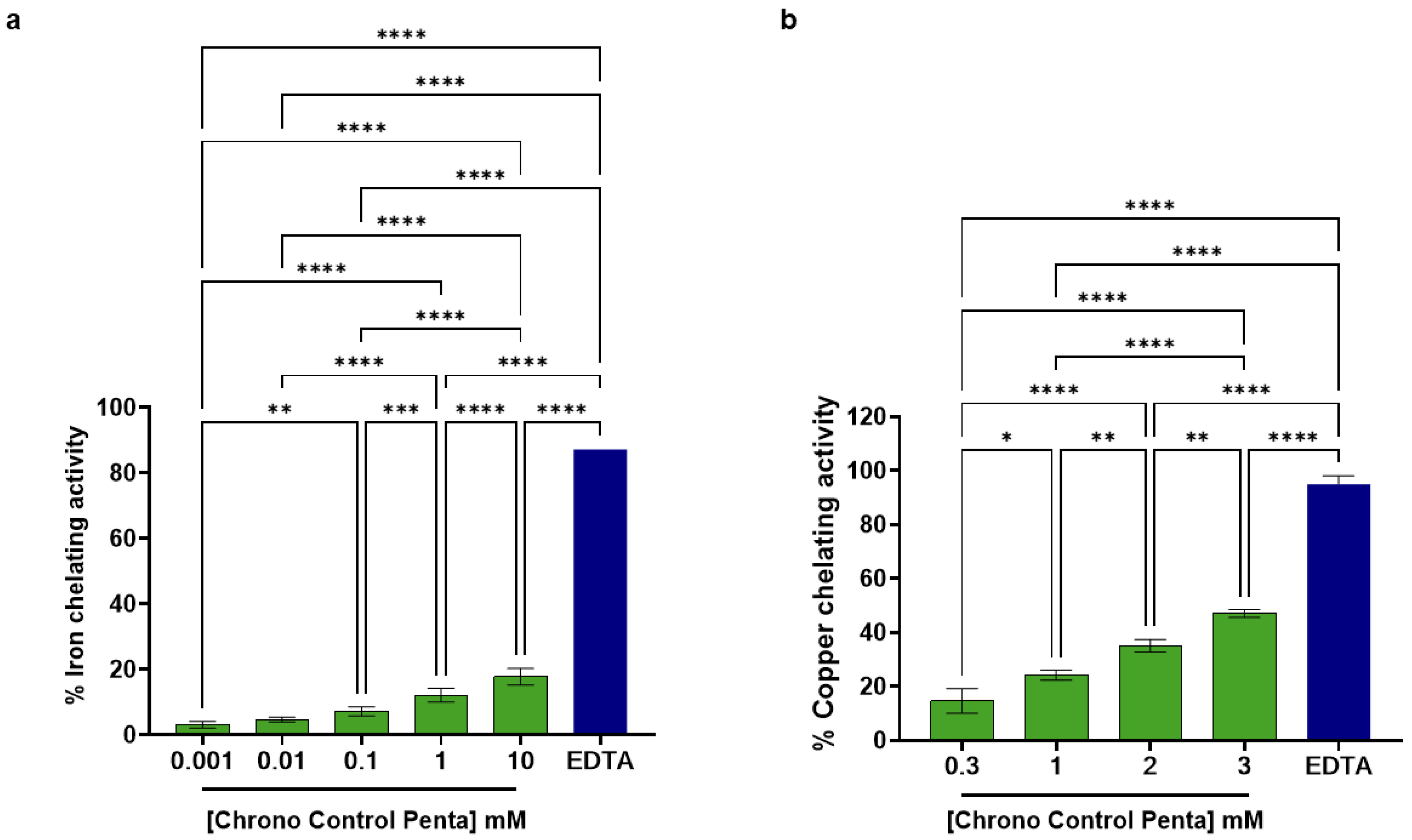 Figure 1b demonstrate the dose-dependent ability of Chrono Control Penta to chelate copper ions in a tested concentration range between 0.3 and 3 mM. In detail, Chrono Control Penta could chelate copper ions by 14.71 ± 4.56%, 24.21 ± 1.85%, 35.14 ± 2.35%, and 47.08 ± 1.49% at the final tested doses of 0.3, 1.0, 2.0, and 3.0 mM, respectively. Additionally, EDTA 0.05%