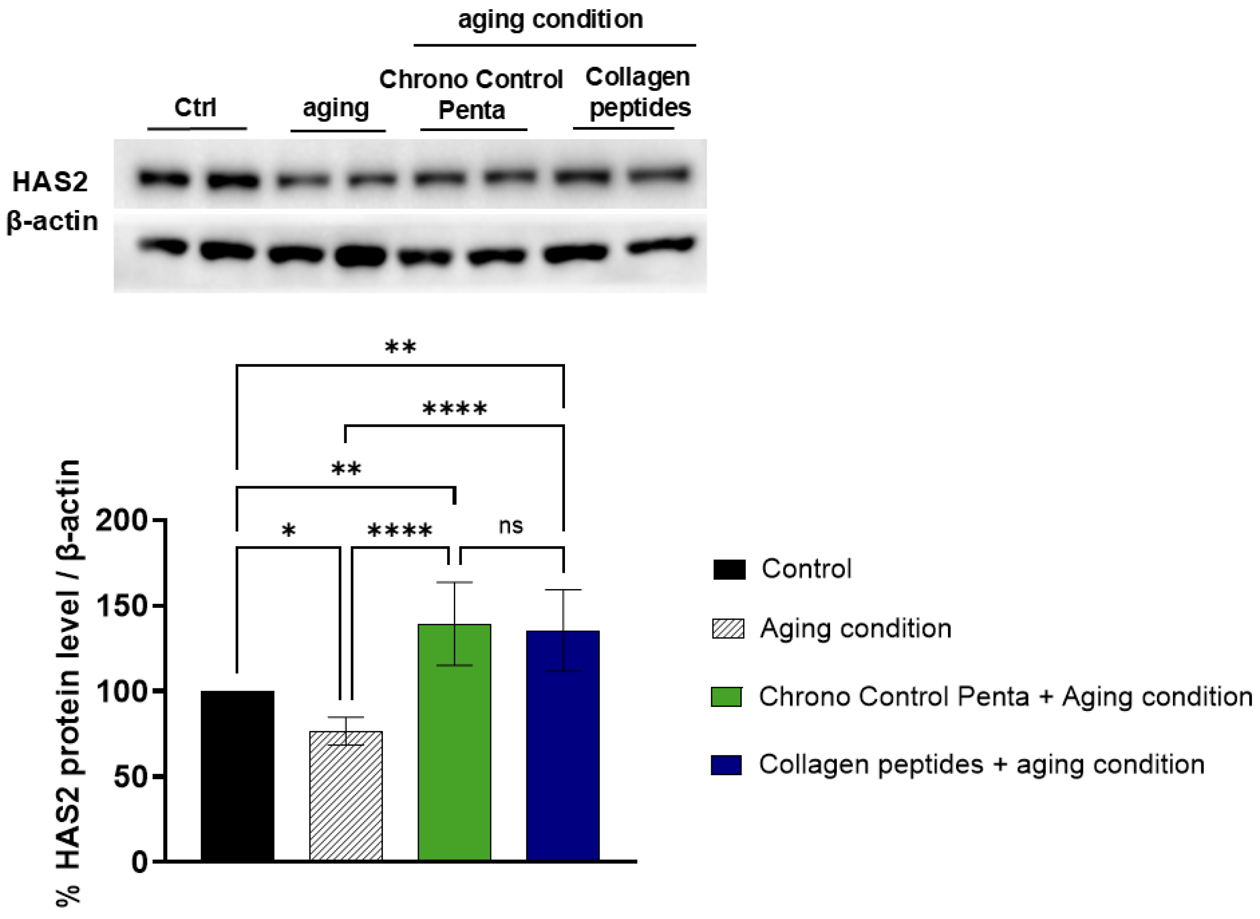 Figure 2). The increase in HAS2 protein levels is comparable to that observed following treatment with collagen peptides, which were used as a positive control, as collagen peptides have been shown to enhance HAS2 expression up to 135.4 ± 23.7% relative to untreated cells, which corresponds to 76.7% augmentation compared to aging conditions.
