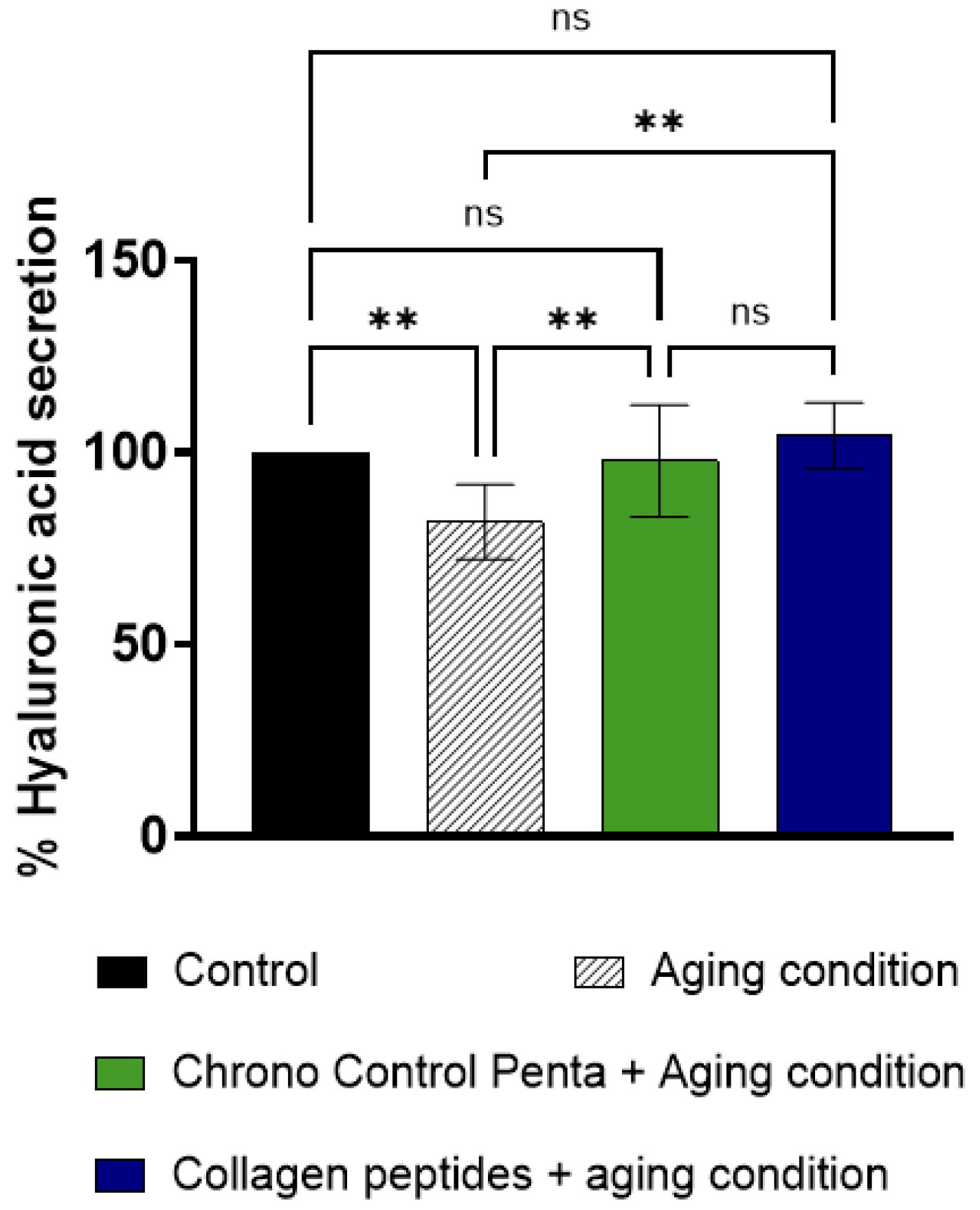 Data thus reveal that Chrono Control Penta was able to enhance HA secretion by 20.11% compared to aging conditions in human fibroblasts; this result is in line with the HAS2 production and this effect is comparable to that observed with collagen peptides treatment (