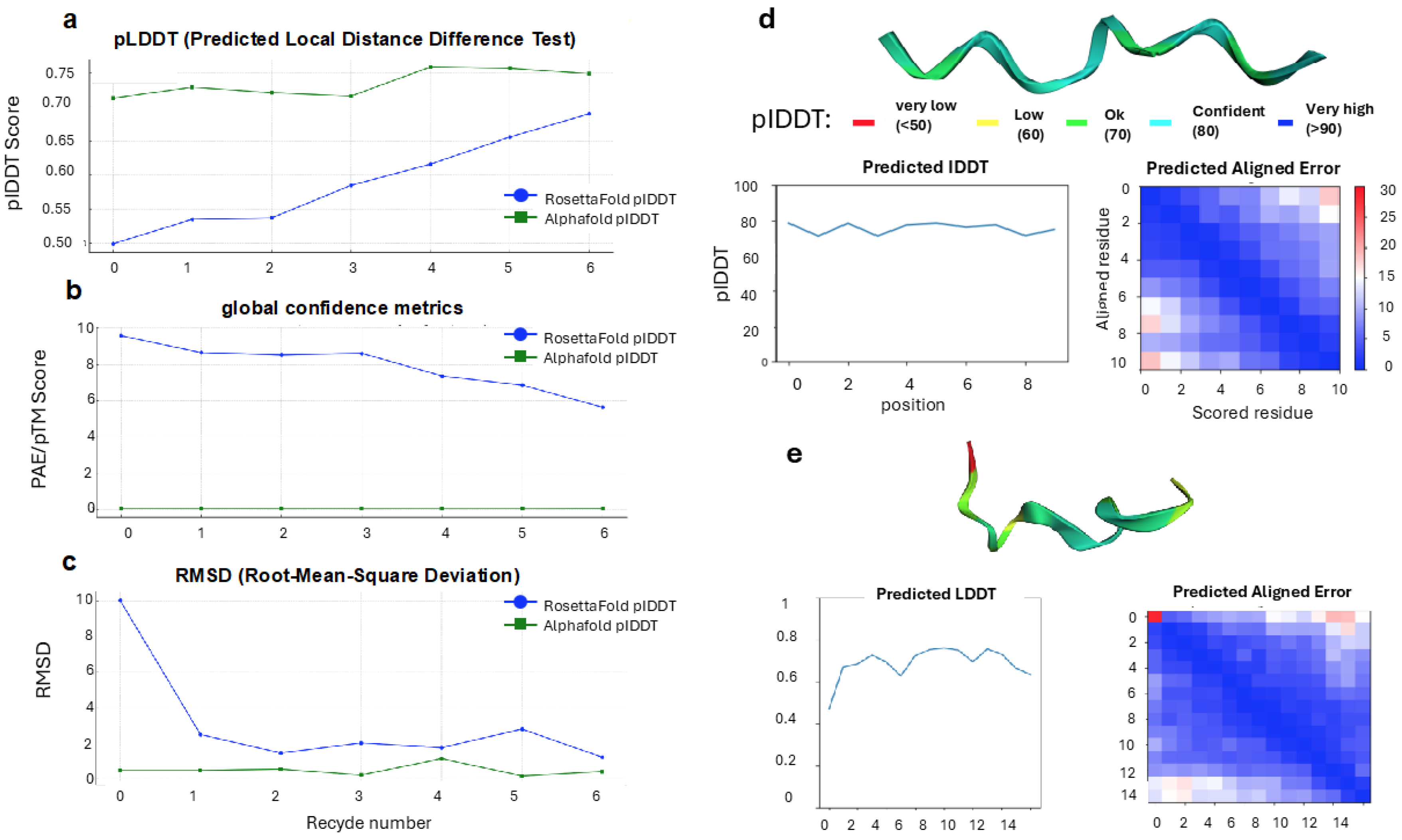 Table 2). AlphaFold2 consistently produced higher confidence scores and lower RMSD values, achieving accurate predictions with minimal recycles. Its stable pTM scores and minimal RMSD tolerance highlight its efficiency and precision, especially in capturing compact secondary structures. RosettaFold, while initially less accurate, displayed a clear trajectory of improvement, progressively reducing both PAE and RMSD with each recycle. This iterative refinement behavior underscores the strength of RosettaFold’s three-track network, which integrates sequence, distance, and coordinate representations to incrementally improve model geometry.