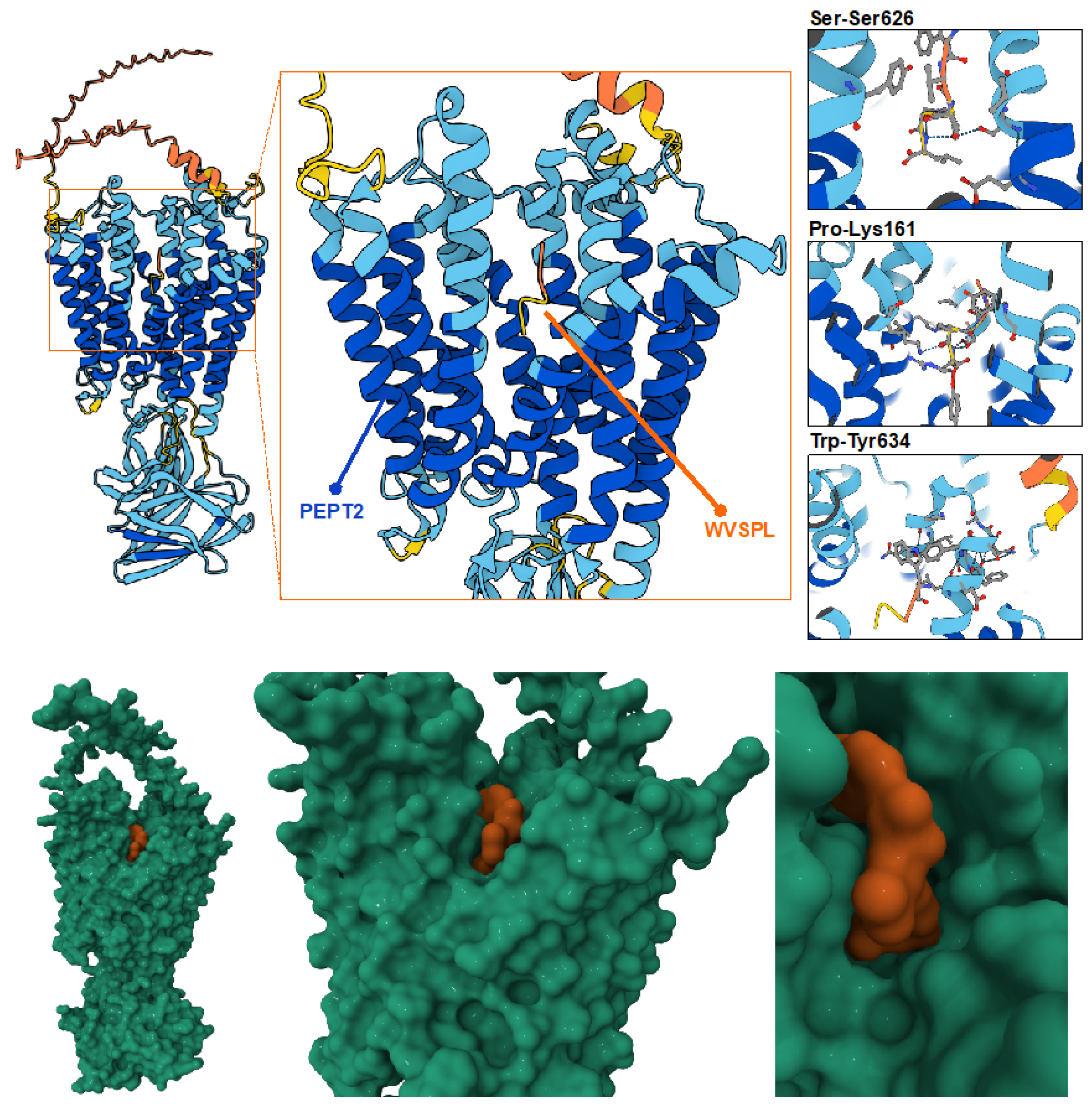 Figure 4). The most stable conformation obtained from AlphaFold2 was subsequently employed for molecular docking analysis with the PEPT2 receptor, a proton-dependent oligopeptide co-transporter implicated in peptide translocation across epithelial tissues, where it is clearly expressed (