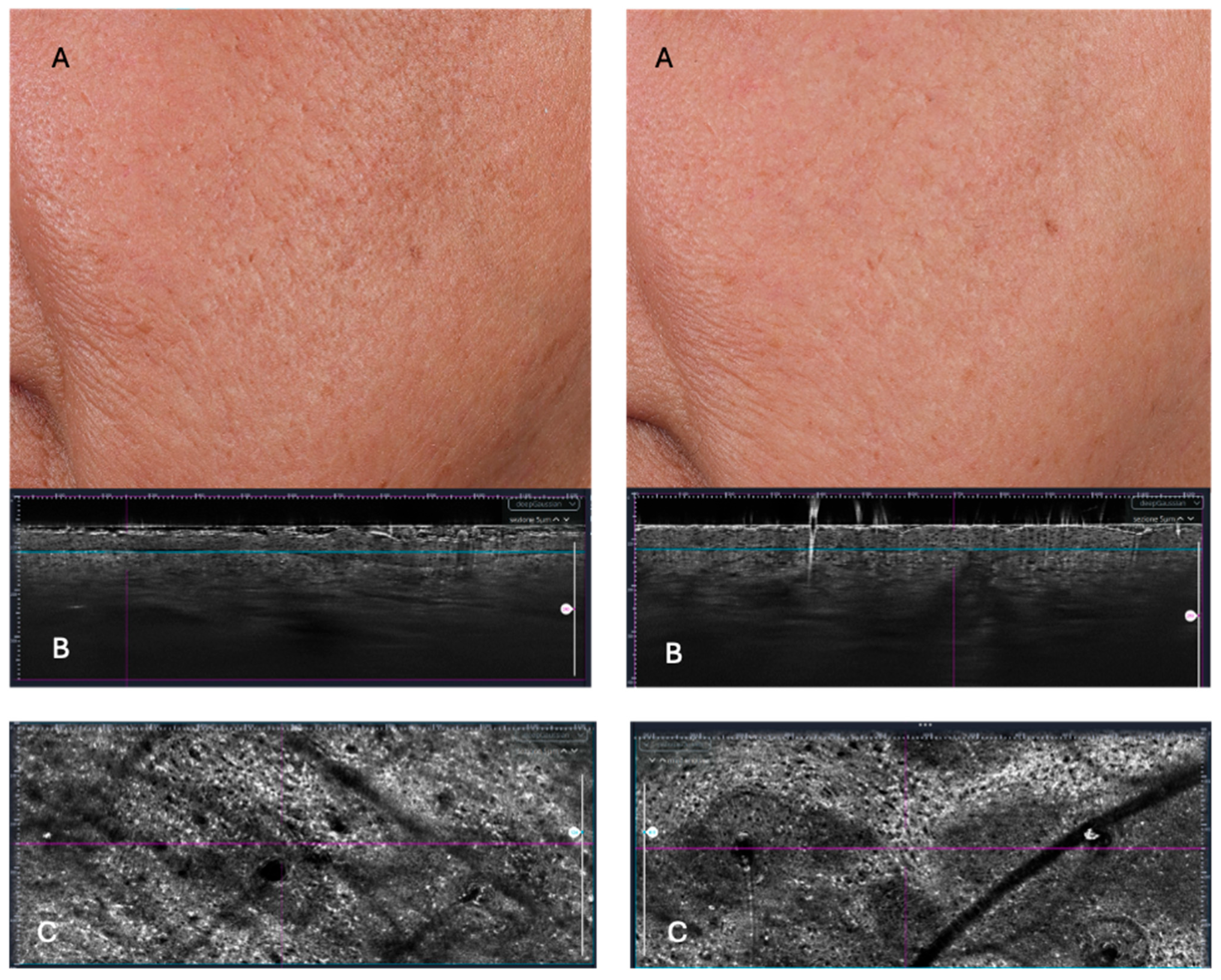 - Goberdhan, L.T.; Pellacani, G.; Ardigo, M.; Schneider, K.; Makino, E.T.; Mehta, R.C. Assessing changes in facial skin quality using noninvasive in vivo clinical skin imaging techniques after use of a topical retinoid product in subjects with moderate-to-severe photodamage. Skin Res. Technol. 2022, 28, 604–613. [Google Scholar] [CrossRef]