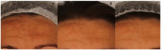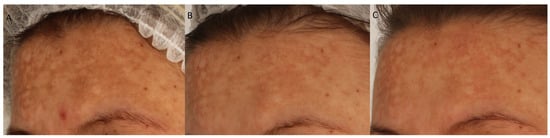 Change in the intensity of melasma on the forehead of Volunteer 1 before (A), 2 weeks after (B) and 8 weeks after (C) a series of 6 treatments, right side.