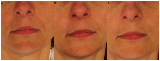 Change in the intensity of melasma on the chin and around the mouth of Volunteer 3 before (A), 2 weeks after (B) and 8 weeks after (C) a series of 6 treatments.