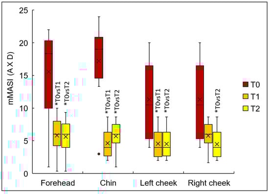 The product of the A and D values of the mMASI scale in different facial areas (not including the coefficients of 0.3 and 0.1) before (T0), 2 weeks (T1) and 8 weeks (T2) after the treatments, calculated based on the mean score of three experts; x-mean, ―median, box-interquartile range, mustache—minimum maximum non-extending, point- outlier, * p < 0.05.