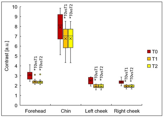The GLCM contrast in different facial areas before (T0), 2 weeks (T1) and 8 weeks (T2) after treatments; x-mean, ―median, box-interquartile range, mustache—minimum maximum non-extending, point- outlier, * p < 0.05.
