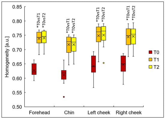 The GLCM homogeneity in different facial areas before (T0), 2 weeks (T1) and 8 weeks (T2) after treatments; x-mean, ―median, box-interquartile range, mustache—minimum maximum non-extending, point- outlier, * p < 0.05.