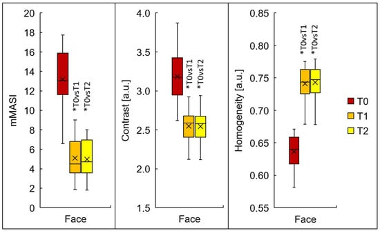 Assessment of whole-face hyperpigmentation before (T0), 2 weeks (T1) and 8 weeks (T2) after treatments using the mMASI scale (average of three experts) and the GLCM method (contrast, homogeneity), where the values of the different facial zones were multiplied by factors and their sums calculated (forehead × 0.3 + right cheek × 0.3 + left cheek × 0.3 + chin × 0.1) x-mean, ―median, box- interquartile range, mustache—minimum maximum non-extending, point- outlier, * p < 0.05.