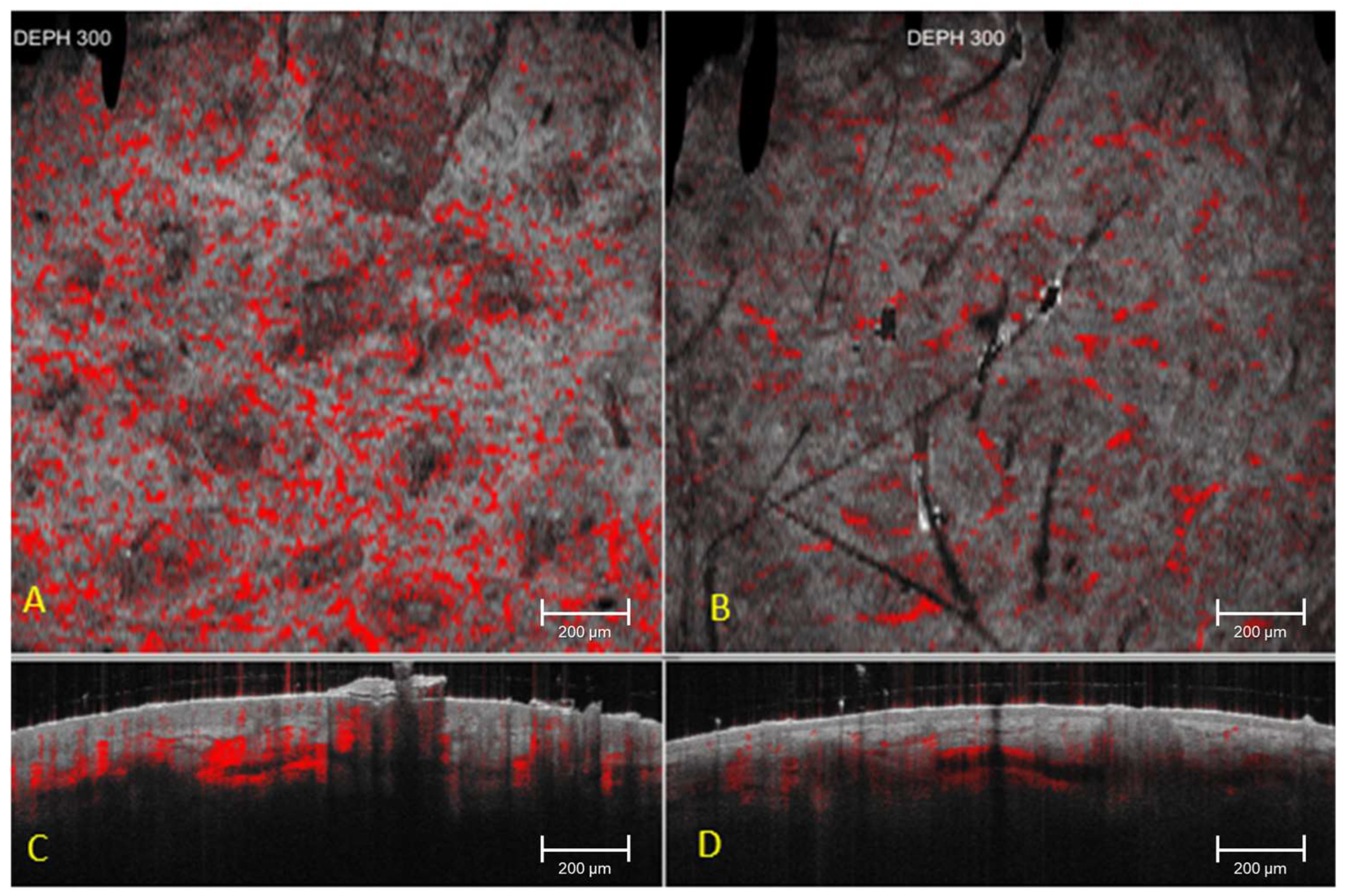 - Schuh, S.; Holmes, J.; Ulrich, M.; Themstrup, L.; Jemec, G.B.E.; De Carvalho, N.; Pellacani, G.; Welzel, J. Imaging Blood Vessel Morphology in Skin: Dynamic Optical Coherence Tomography as a Novel Potential Diagnostic Tool in Dermatology. Dermatol. Ther. 2017, 7, 187–202. [Google Scholar] [CrossRef] [PubMed]