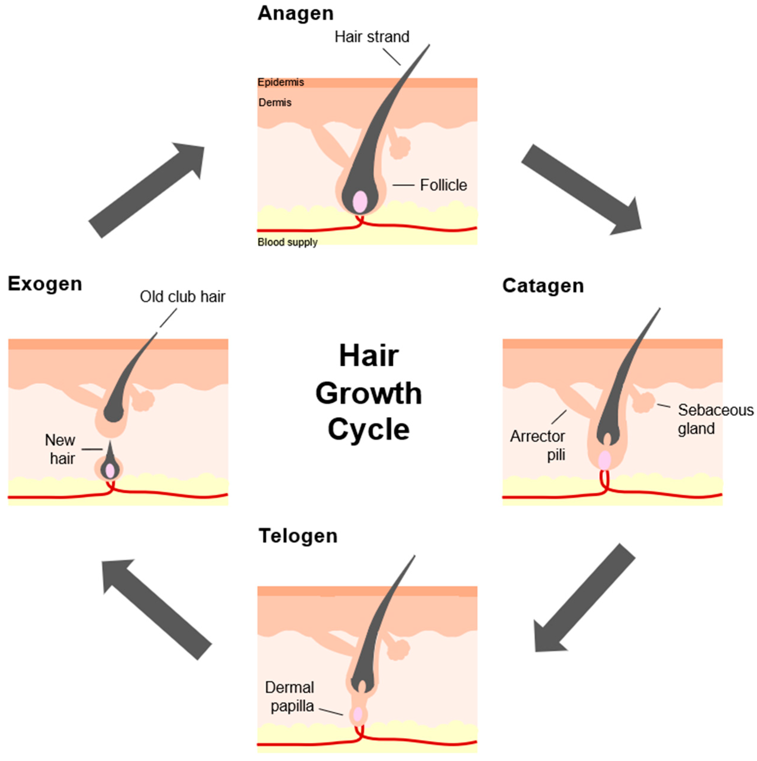 - Natarelli, N.; Gahoonia, N.; Sivamani, R.K. Integrative and mechanistic approach to the hair growth cycle and hair loss. J. Clin. Med. 2023, 12, 893–923. [Google Scholar] [CrossRef]