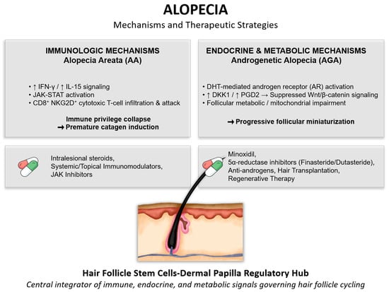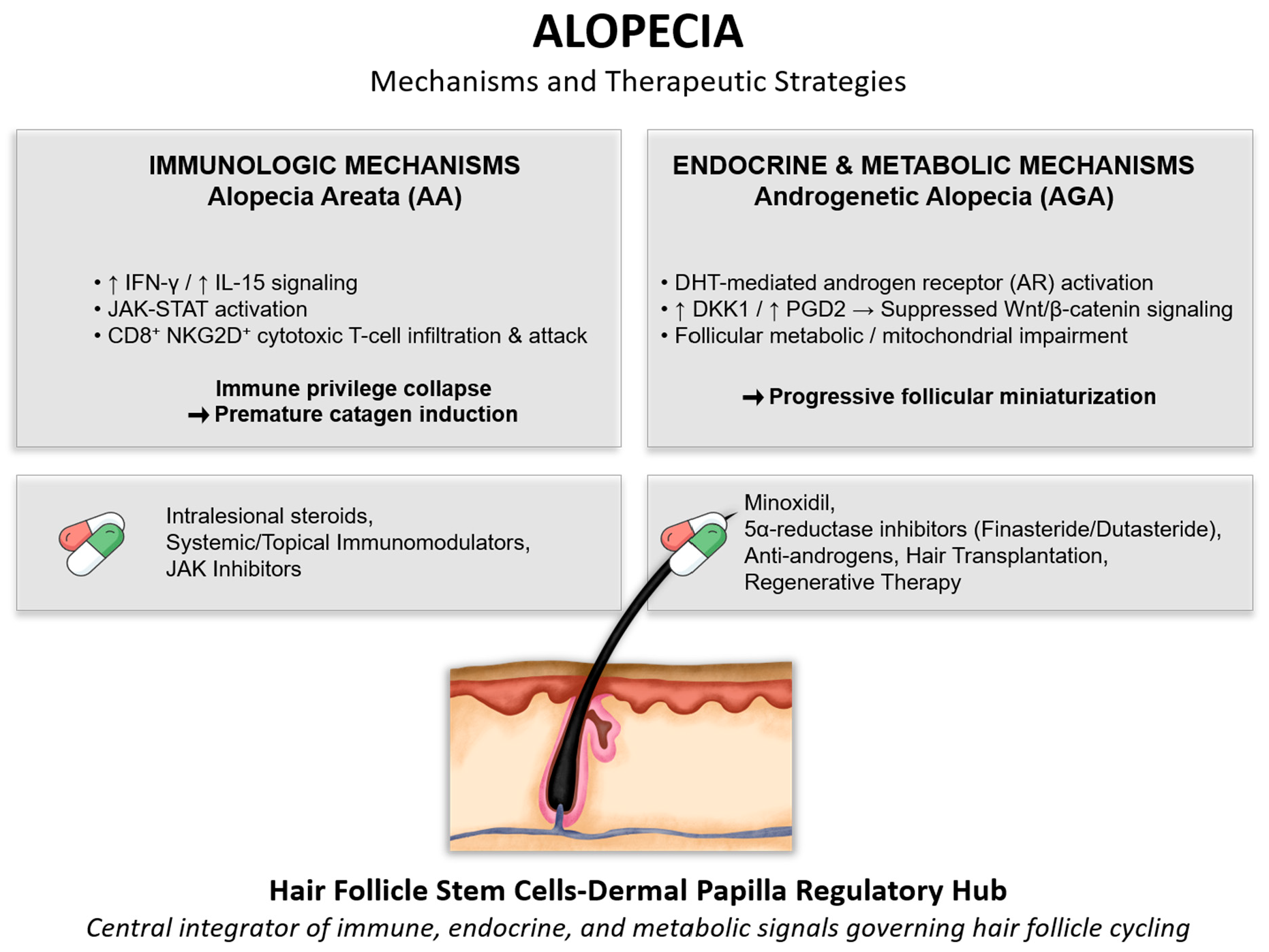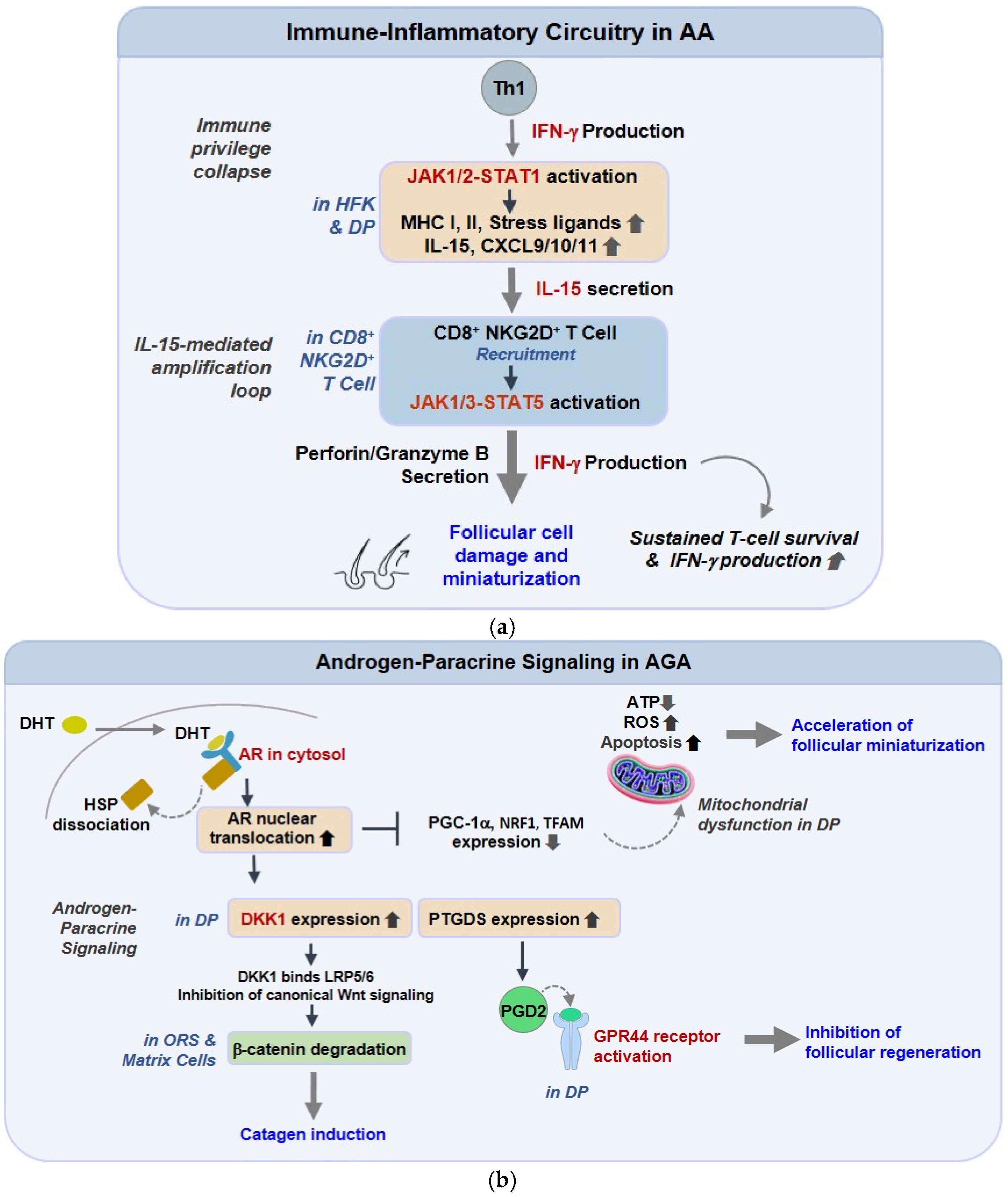 | Immune/ inflammatory mechanism | IFN-γ/JAK-STAT | JAK1/2/3, STAT1/3/5, IL-15, CXCL9/10/11 | Mediates immune privilege collapse in AA; promotes T-cell infiltration and cytokine amplification | Baricitinib, Ritlecitinib, Deuruxolitinib, TYK2 inhibitors | [135,136,137,138,139] |