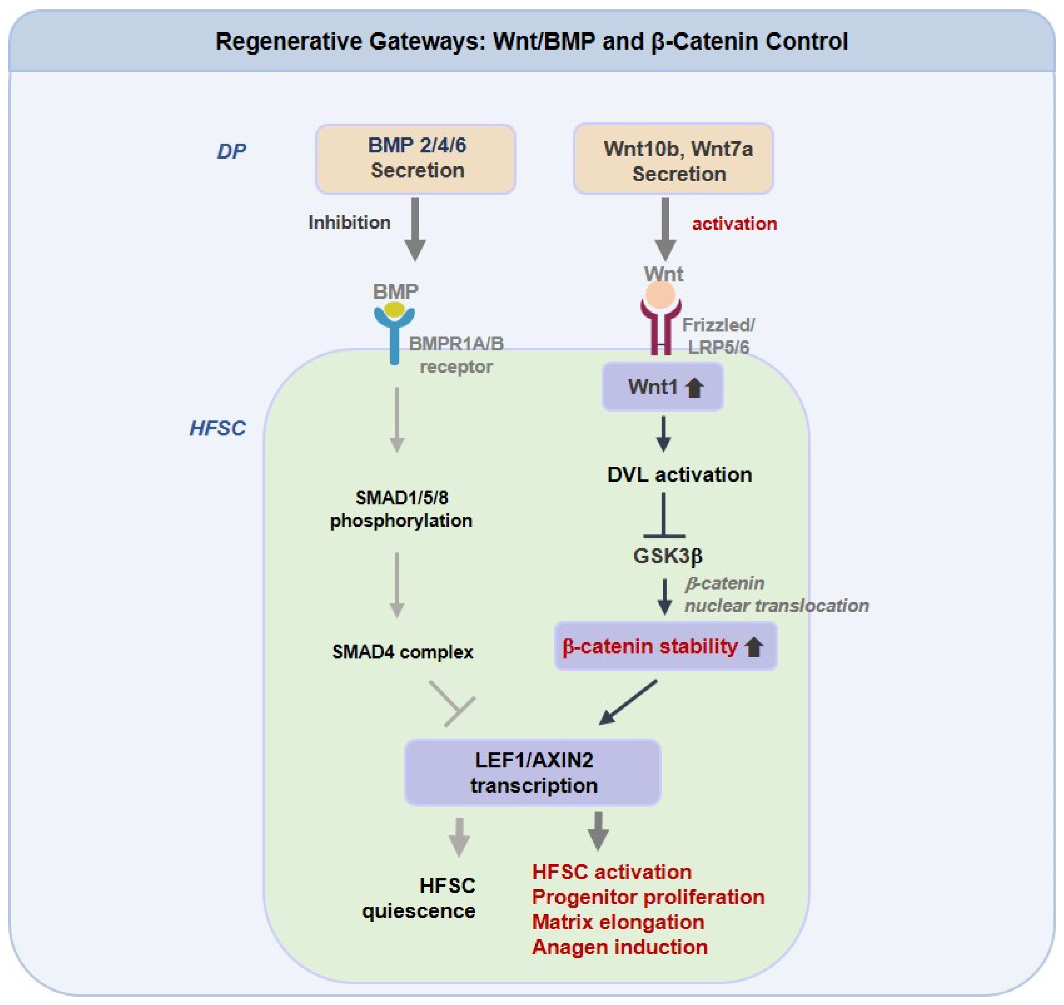 | Regenerative Gateways | Wnt/β-Catenin/BMP | Wnt10b, Wnt7a, β-catenin, LEF1, BMP2/4 | Controls stem-cell activation and anagen initiation; imbalance causes impaired regeneration | Valproic acid, KY19382, Lithium chloride, Wnt agonists, BMP inhibitors | [78,145,146,147,148,149] |