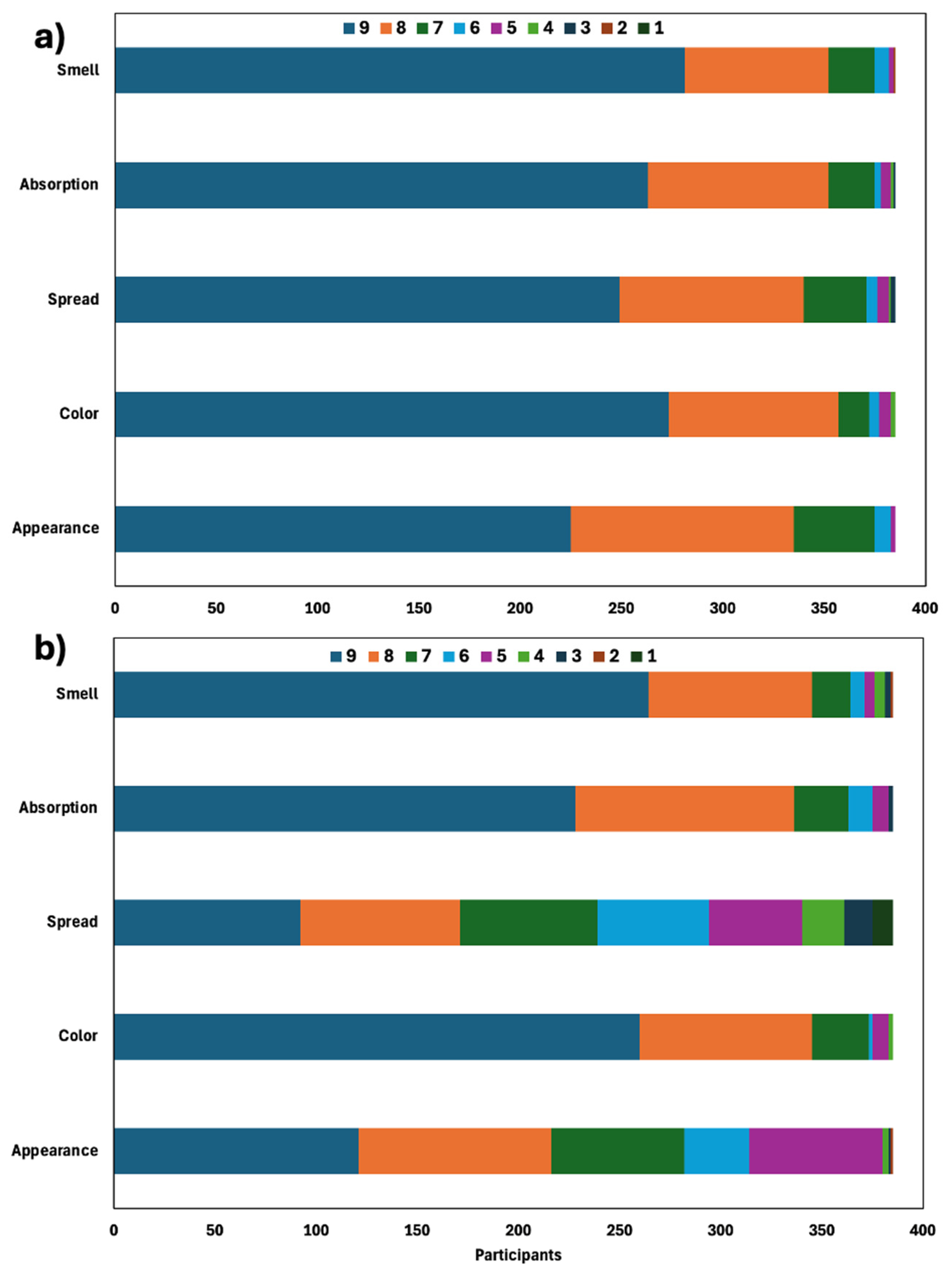 2.6. Sensory Evaluation of Orange Peel Essential Oil Antibacterial Gels