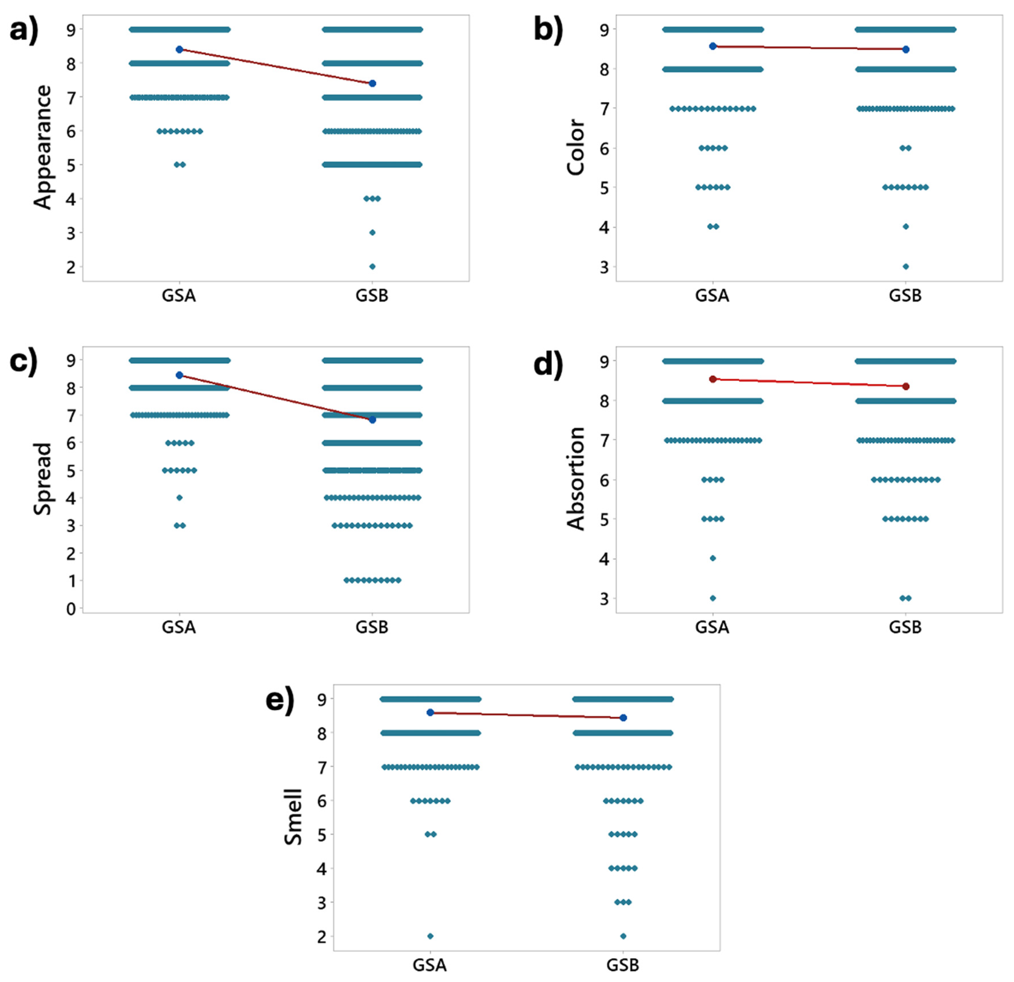 | Smell | 8.603 | 0.801 | 8.455 | 1.103 | 2.130 | 0.033 |