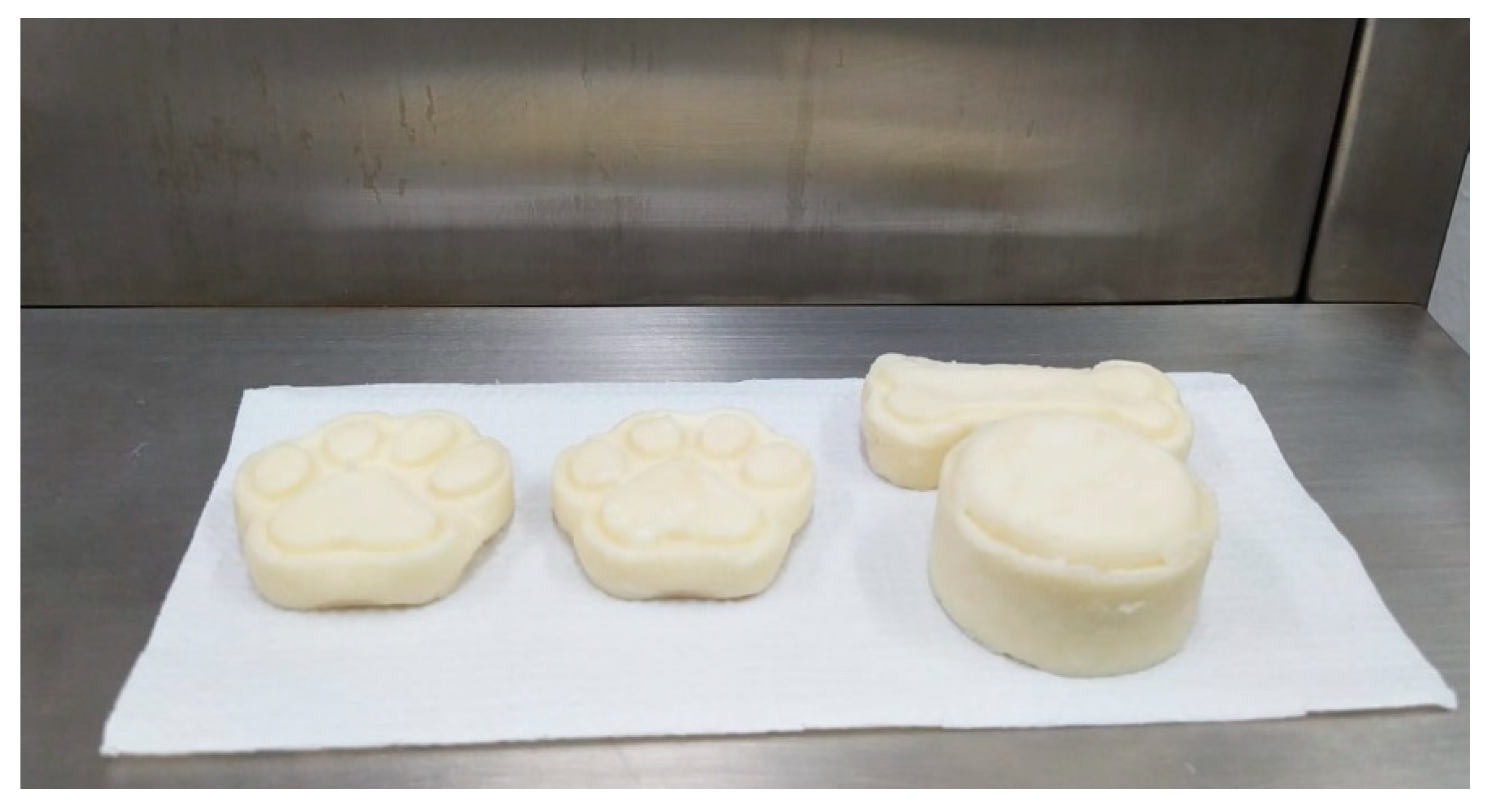 The samples had a uniform, consistent appearance and acceptable firmness. The evaluation of the product’s appearance after use showed satisfactory results, as no samples showed cracks or structural changes after 24 h. The samples had the same light beige color, which indicates the stability of the method used. The samples had a very mild scent since no fragrances were added to the formulation. Formulations for pets need to be gentler to avoid disturbing the animals, whose sense of smell is more acute than humans.