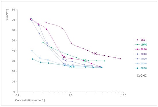 By representing the concentration (logarithmic scale) versus the surface tension in solutions of the mixtures of each surfactant and the pure ingredients (Figure 1), the Critical Micelle Concentration (CMC) and the minimum surface tension of each of them were determined. From Figure 1, it can be easily observed how the SLS + LDAO mixtures are able to reach a lower surface tension, as well as a lower CMC (indicated with an X) compared to individual surfactants.