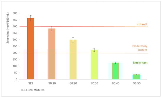 The results obtained regarding protein denaturation are shown in Figure 2, where the Zein number is expressed in mgN/100 mL of solution. According to these results, the higher the proportion of LDAO in the mixture, the lower the irritant potential. The value obtained for SLS corresponds to a type I irritant according to the Zein method classification scale. The 90:10, 80:20, and 70:30 mixtures would be classified as moderately irritating and the 60:40 and 50:50 mixtures as non-irritating.