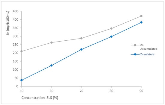 Comparison of accumulated Zn and experimental (Zn mixture) for SLS + LDAO mixtures as a function of the SLS concentration.