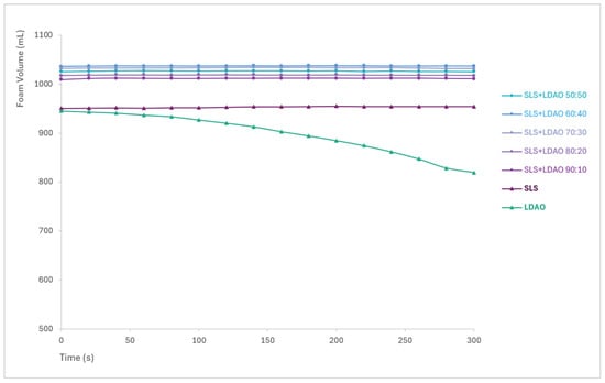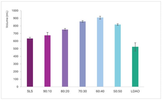 Foam generated by SLS and its mixtures remained stable throughout the 5 min observation period, with no significant volume loss. In the case of LDAO, the foam generated is not as stable, with a clear decrease in volume. Although LDAO alone exhibits lower foam generation and stability, it can be used as a co-surfactant to improve the foaming properties of SLS, with the improvement offered being proportional to the % of LDAO.