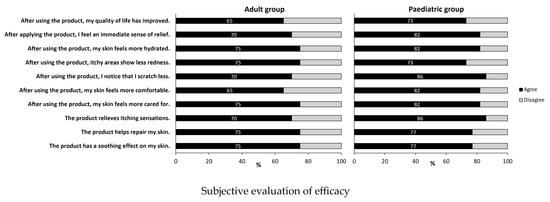 In adults, symptom improvement was paralleled by enhanced quality of life, as reflected in the significant reduction in DLQI domains related to itching, pain, and work or study discomfort. This highlights the potential of dermocosmetic interventions to contribute meaningfully to daily comfort and perceived well-being. In the paediatric group, subjective assessments were completed by parents or legal guardians, providing valuable insight not only into the perceived skin improvement in children but also into the caregivers’ quality of life. Caregivers of children with AD often experience elevated stress and emotional burden, and perceiving visible improvement in their child’s skin could contribute to reduced family distress and better adherence to care routines [25,26].