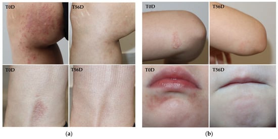 Representative images showing the improvement in skin condition in adult (a) and paediatric (b) volunteers over 56 days of product application.