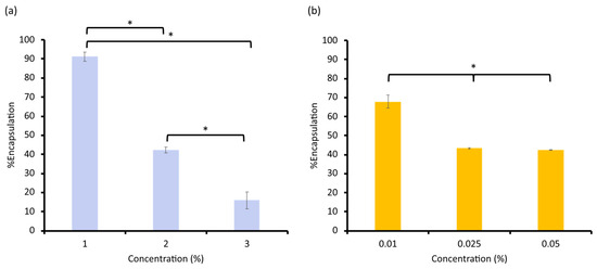 The percentage of encapsulation efficiency of (a) KA and (b) licochalcone A in the liposomes (* Significant difference, p < 0.05).