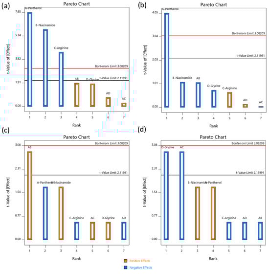 The rate at which the mask dissolved within 5 min (Figure 2c) was significantly influenced by the interaction between panthenol and niacinamide (AB). This interaction had a strong positive effect, suggesting that the combination accelerated water absorption and fiber disruption. This synergy may stem from their combined hydrophilicity and capacity to disrupt the physical structure of the dry matrix. Other factors had moderate but non-significant effects, suggesting that dissolution behavior in the initial phase was primarily governed by interactive rather than individual effects. At the 10 min mark (Figure 2d), the most influential factors shifted. Both glycine (D) and the AC interaction (panthenol × arginine) had significant negative effects, implying that they slowed dissolution. Glycine, being a zwitterionic amino acid, may reinforce the internal hydrogen-bonded structure, while the AC interaction might create a more cohesive film network. In contrast, panthenol (A) and niacinamide (B) showed moderate positive effects, potentially promoting longer-term disintegration via gradual water uptake. This contrast between 5 and 10 min profiles underscored the complexity of formulation behavior where early dissolution was enhanced by hydrophilic synergy, but extended integrity may be preserved by amino acid network effects.