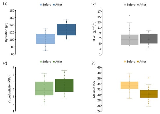 Key biophysical parameters, which were skin hydration, TEWL, elasticity, and melanin index, were monitored to assess short-term cosmetic performance. As illustrated in Figure 4a, a statistically significant increase in skin hydration was observed after treatment. This enhancement was presumably attributed to the synergistic combination of humectants alongside the mask’s hydrogel-based film-forming matrix. The film provided occlusion, which reduced water evaporation and promoted moisture retention, thereby enhancing the stratum corneum’s water-binding capacity [51]. This immediate hydrating effect was also positively noted by participants in the satisfaction survey, reinforcing the clinical findings. TEWL (Figure 4b) measurements showed a downward trend post-application, suggesting improved barrier integrity. Although the reduction was not statistically significant, the observed change indicated that regular use of the formulation may contribute to restoring or maintaining epidermal barrier function. The presence of glycine, arginine, and niacinamide, which are known to support lipid synthesis and skin structure, likely contributed to this effect [52,53]. Viscoelasticity improved modestly following treatment, reflecting increased skin suppleness and elasticity, as presented in Figure 4c. This effect is consistent with enhanced hydration status and may also be linked to the inclusion of collagen-supportive ingredients such as glycine and arginine, which provide structural amino acids involved in extracellular matrix regeneration [54]. Although the change was not dramatic, the upward shift in elastic response supported the long-term benefits of the formulation for skin texture and resilience.