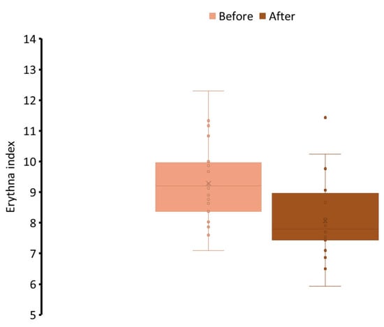 The participants’ erythema index, which indicates the irritation effect of the face mask after 7-day application.