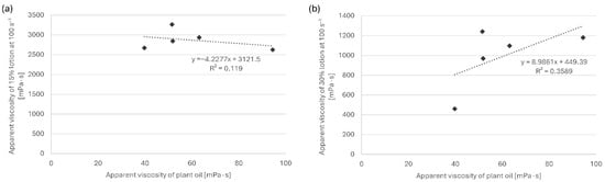 Correlation between apparent viscosities of plant oils and the corresponding emulsions prepared with (a) 15% oil and (b) 30% oil.