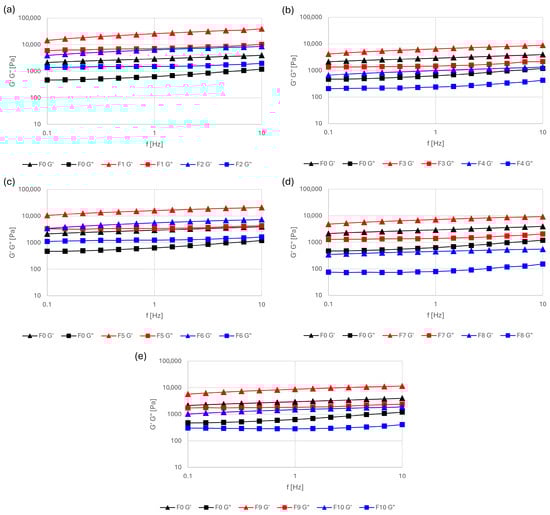 Changes in storage modulus (G′) and loss modulus (G″) of the emulsion lotions as a function of frequency (0.1–10 Hz) at a constant shear stress of 1 Pa: (a) F1 and F2, (b) F3 and F4, (c) F5 and F6, (d) F7 and F8, and (e) F9 and F10, each compared with the control formulation F0.