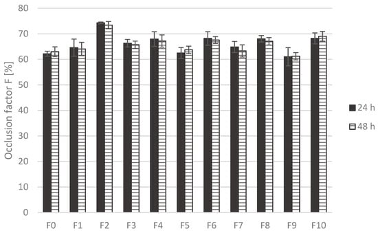 The in vitro occlusion test demonstrated that all formulations exhibited high occlusion factors (F > 60%) after both 24 h and 48 h (Figure 3). The occlusion factors of individual formulations did not change significantly between the two time points. The incorporation of plant oils increased occlusivity in both concentration levels, although statistically significant higher values (p < 0.05) were recorded only for the formulations containing 30% olive oil (F2) at both time points and 30% grape seed oil (F10) after 48 h. Statistically significant differences (p < 0.05) were also confirmed emulsions containing the same type of oil at the two tested concentrations (olive oil: F1 vs. F2; grape seed oil: F9 vs. F10), at both 24 h and 48 h.