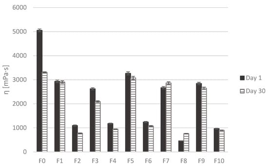 Apparent viscosity of the emulsions at a shear rate of 100 s–1 measured on day 1 and day 30.