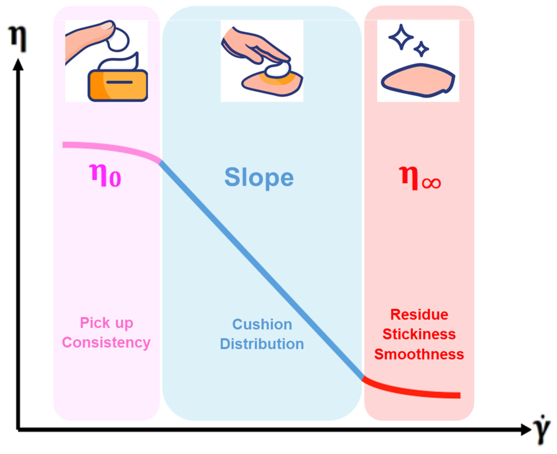 | Commercial sunscreens | Rub-out | Spreadability | Viscosity, Consistency, Cohesiveness (−) | [84] |