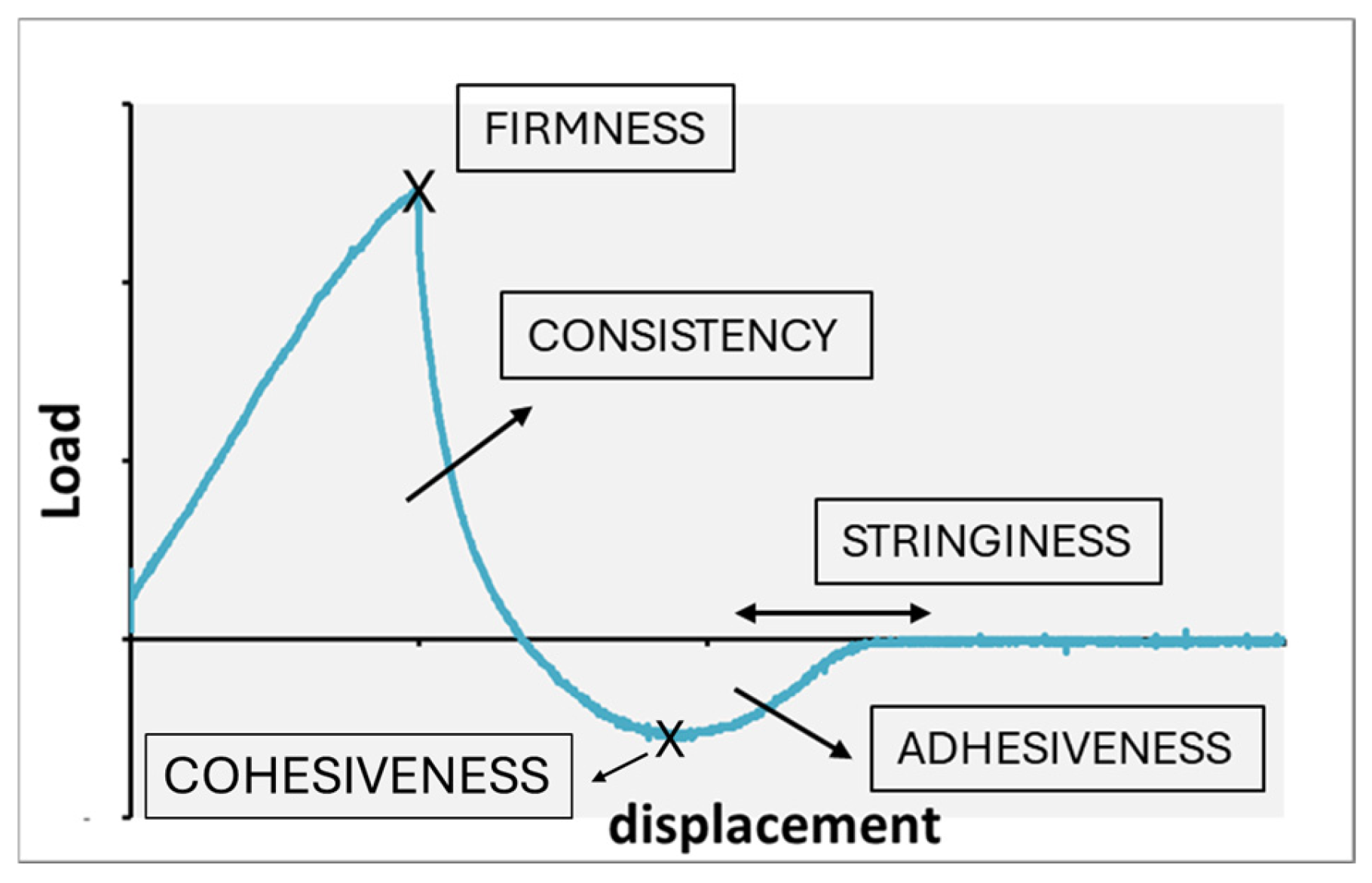 | Lab-prepared and commercial O/W emulsions | Pick-up | Penetration force | Positive area under texture curve (+) | [79] |
