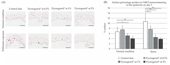 (A) Representative images of the immunostaining of Nrf2 in skin explants upon different conditions, treated with Pycnogenol® (0.5–2%), without (normal condition) and with exposure to pollution (stress). Scale bar (black solid line): 50 µm (325 pixels). Black dotted line: Interface between the epidermis and the dermis. (B) Relative semi-quantification of the signal intensity by image analysis. *: significant (p < 0.05), **: significant (p < 0.01). 9 images per condition were analyzed.