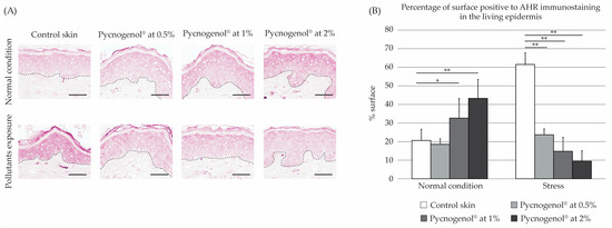 (A) Representative images of the immunostaining of AHR in skin explants upon different conditions, treated with Pycnogenol® (0.5–2%), without (normal condition) and with exposure to pollution (stress). Scale bar (black solid line): 50 µm (325 pixels). Black dotted line: Interface between the epidermis and the dermis. (B) Relative semi-quantification of the signal intensity by image analysis. *: significant (p < 0.05), **: significant (p < 0.0001). 9 images per condition were analyzed.
