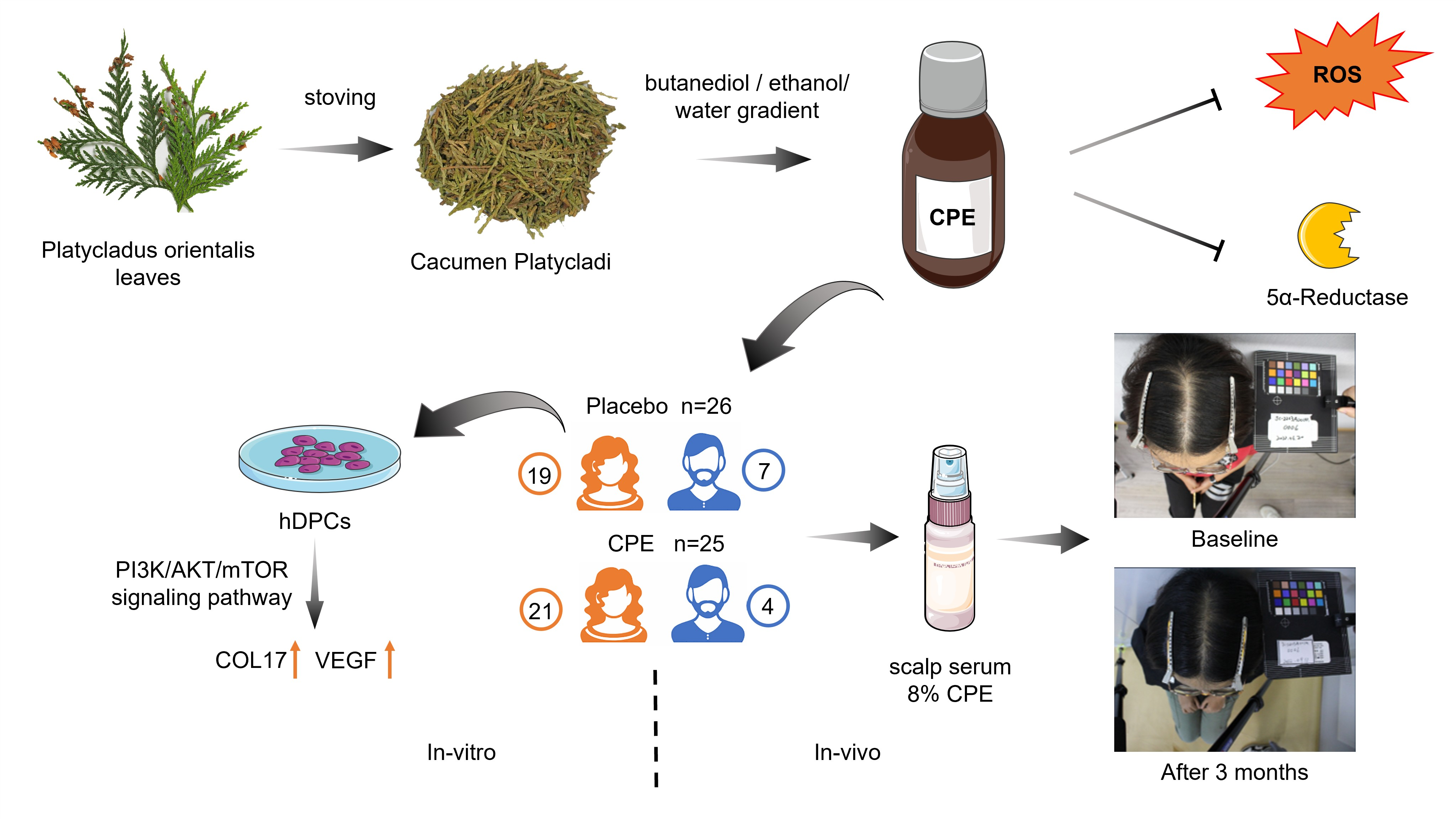 This study presents an extraction method for Cacumen Platycladi using a 1,3-butanediol, ethanol, and water gradient, which allows the selective enrichment of components with varying polarities. LC-MS analysis revealed that the main active components in the CPE are quercitrin, myricetin, and myricitrin. The mechanisms underlying its anti-hair loss effects include inhibiting 5α-reductase activity to reduce dihydrotestosterone-induced damage to hair follicles, enhancing HDPCs’ resistance to oxidative stress, and upregulating PI3K/Akt/mTOR in HDPCs to promote the expression of VEGF and COL17. The results of this study successfully demonstrate the effectiveness of the extraction method and further validate its multi-targeted mechanism of action in hair loss prevention. Furthermore, a 12-week human clinical trial confirmed its effectiveness and safety for preventing hair loss.