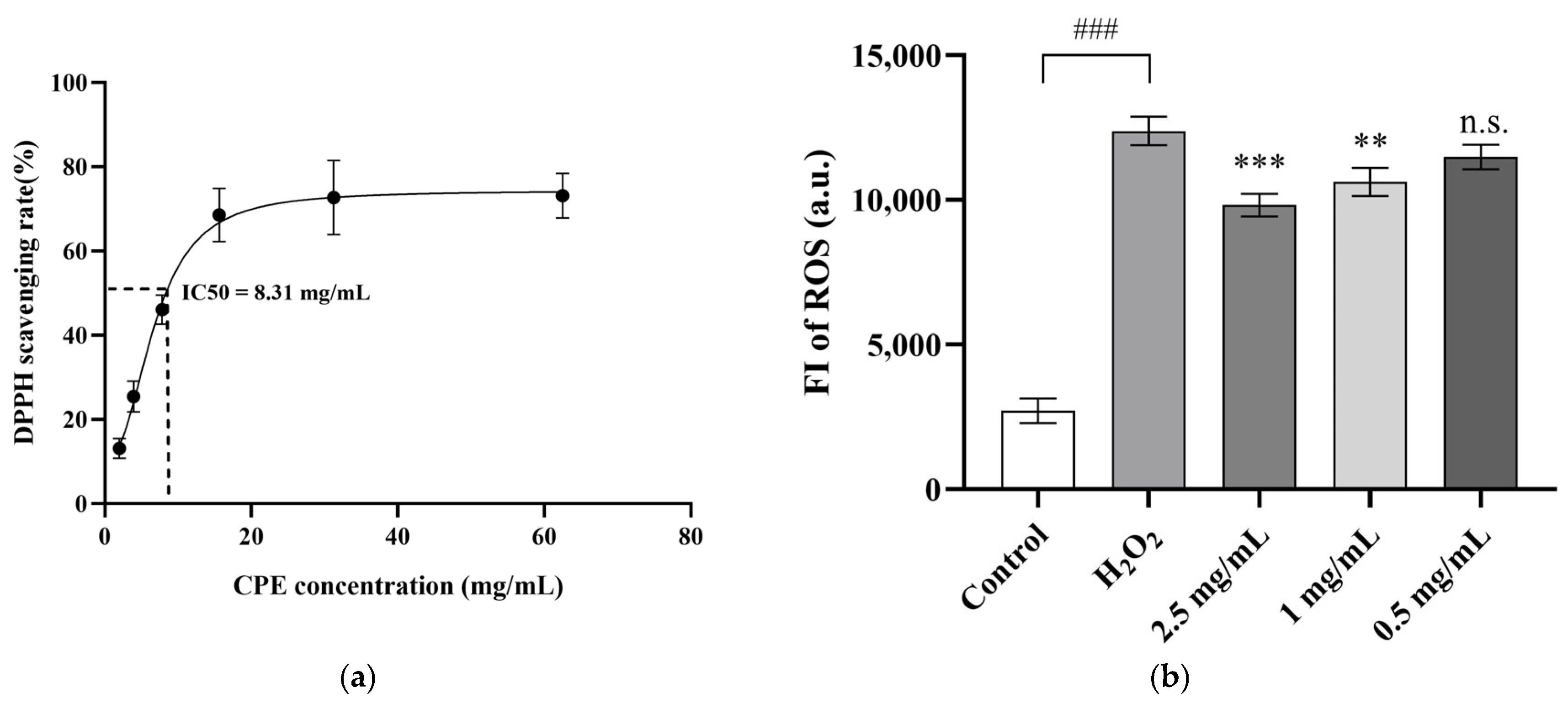 Figure 2. Protective Effect of CPE Against Oxidative Stress Damage in HDPCs. (a) The scavenging rate of DPPH free radicals by different concentrations of CPE was measured, and IC50 was obtained through nonlinear fitting. The concentration corresponding 50% scavenging rate point was indicated by dotted lines. (b) HDPCs were pretreated with CPE, followed by the induction of an oxidative stress damage model using H2O2. Intracellular ROS levels were detected using the DCFH-DA probe. Each group included three replicates, and the results are expressed as mean ± SEM. ### indicates a significant difference between the H2O2 and control groups (p < 0.001, one-way ANOVA). The differences between the CPE and control groups were analyzed by ANOVA: ** p < 0.01, *** p < 0.001, and n.s. p > 0.05.