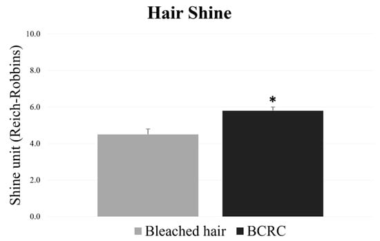 Shine values (Reich–Robbins units) of bleached hair fibers with and without BCRC treatment. Data represent mean ± standard deviation (n = 18). * Statistically significant difference compared to the bleached control group (p < 0.05).