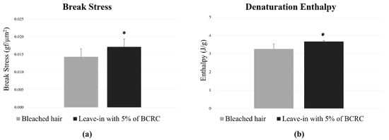 (a) Break stress (gf/µm2) and (b) denaturation enthalpy (J/g) of bleached hair fibers treated or not with leave-in formulation containing 5% BCRC. Data represent mean ± standard deviation (n = 25 for break stress; n = 3 for enthalpy analysis). * Statistically significant difference compared to the bleached control group (p < 0.05).