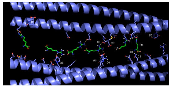 Finally, the simulations showed that the arginine present in BCRC strongly interacts with keratin residues, establishing ionic interactions, hydrogen bonds, and dipole–dipole interactions that act as additional anchoring points within the network (Figure 7 and Figure 8); the formation of crosslinks between keratin filaments could mechanically stabilize the hair fiber.