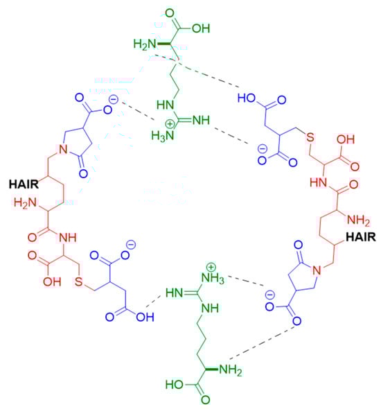 Schematic representation of the crosslinking interactions between modified α-keratin chains and arginine in the presence of itaconic acid. Blue represents itaconic acid, green represents arginine, and red represents amino acids from hair keratin.