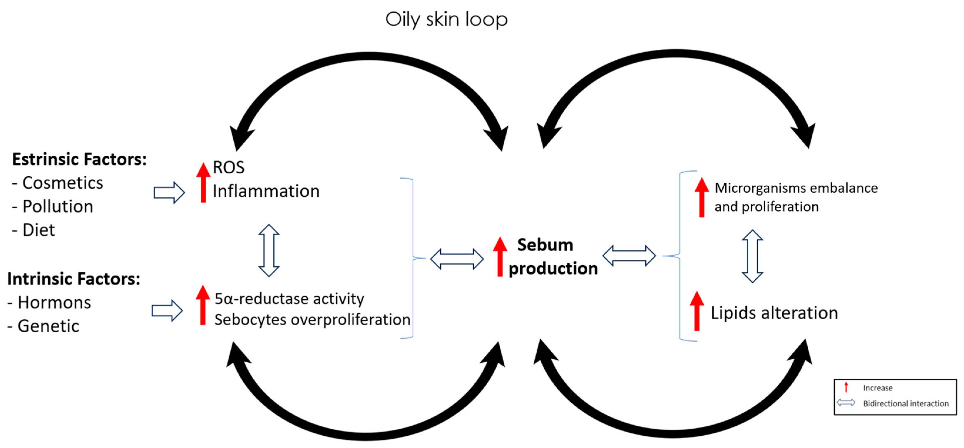 9]. In this loop, extrinsic factors such as pollution, cosmetics, and diet can induce ROS formation and cytokine activation, while intrinsic regulators including hormonal signaling and genetic predispositions enhance 5α-reductase activity and sebocyte proliferation [