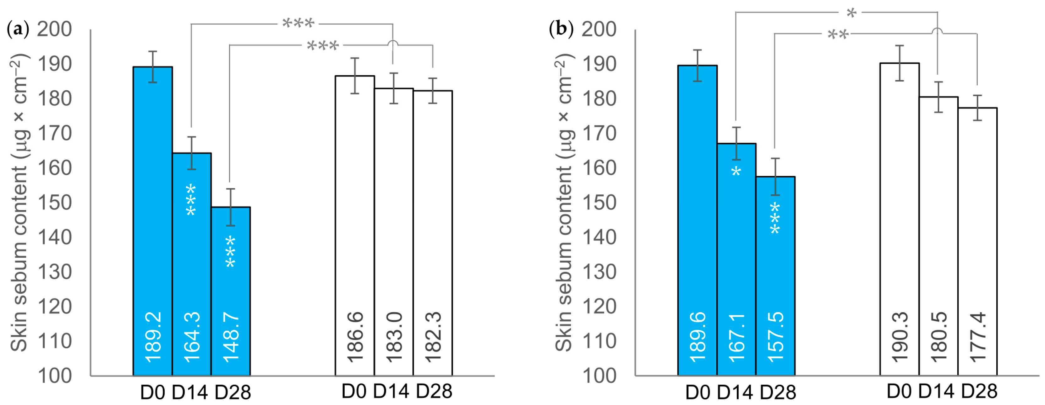Section 2.2.2. Participants), collected the medical history, and recorded baseline values for all trial outcomes. The outcome measures were then evaluated at D14 and D28. These included the skin sebum content (measured on both the forehead and alar grooves), sebum excretion rate (SER), pore diameters, TNF-α levels, skin microbiome composition, and skin lipids profile. All outcome measures were assessed at D14 and D28, except for the TNF-α levels, skin microbiome, and skin lipid content, which were evaluated only at baseline (D0) and D28.