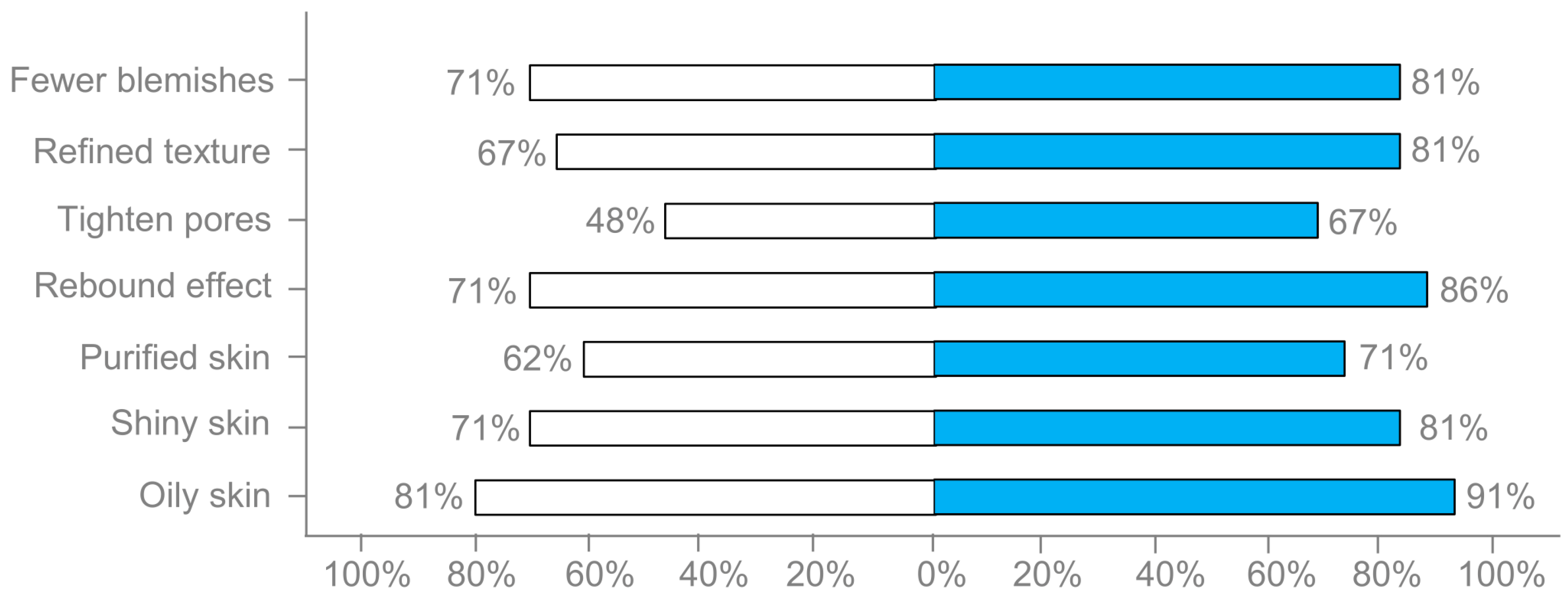 The subjective perception data further support the instrumental results. Participants reported significantly higher improvement in the PRF-treated hemiface. Importantly, the mattifying effect lasted over 7 h post-application, twice as long as the placebo, highlighting the product’s consumer-relevant benefit in managing oily skin.