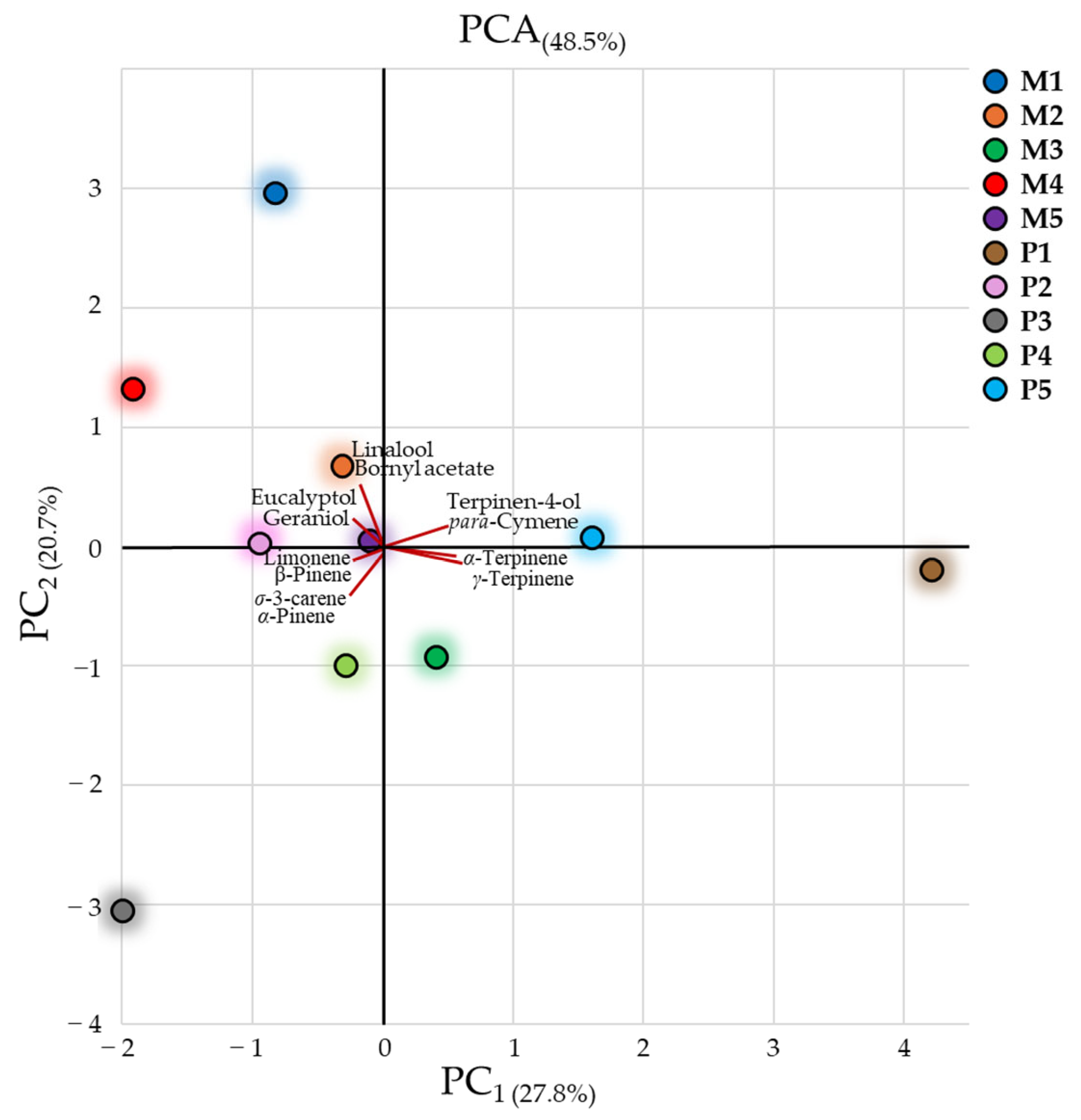 3.1. Chemical Composition of Essential Oils and Principal Component Analysis